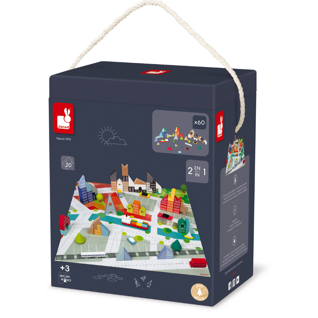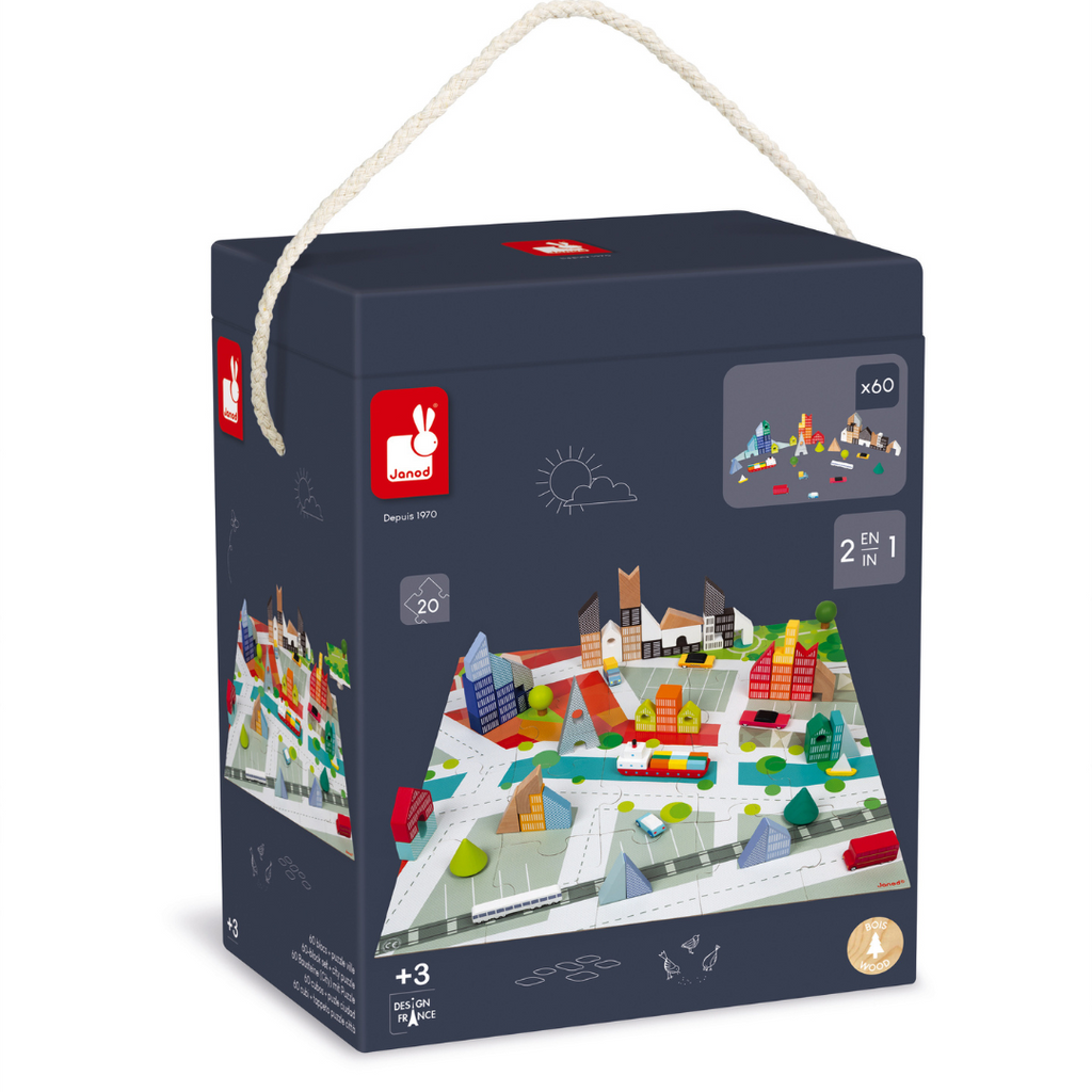 This two in one game is both a puzzle and play mat that allows you to use wooden pieces to create your very own city. Once you've completed the 20-piece puzzle that features roads, streets, tracks, and waterways, it's time to add the wooden trams, cars, boats, and buildings to bring your city to life. The set includes 60 blocks total.